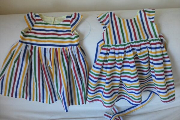 I made these cute stripey dresses after I was inspired by Janetย over at KitchenTableSewing. An adorable little girl’s dress. I used a multicolor stripe poly cotton bought from Leeds Market....